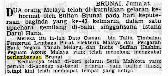 Antara keratan yang penting termasuklah laporan tentang penganugerahan gelaran kehormat “Setia Mahkota” kepada Dato Osman bin Talib dan Tun Mohamed Suffian Hashim oleh Sultan Brunei. Penganugerahan ini dilaporkan secara rasmi dalam akhbar tempatan sempena sambutan ulang tahun keputeraan Sultan Omar Ali Saifuddien III, membuktikan bahawa jasa mereka bukan sekadar sokongan teknikal biasa, tetapi diiktiraf sebagai sumbangan besar terhadap pembentukan sistem pemerintahan negara.