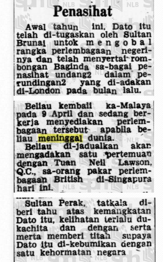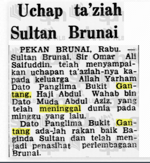 Selain itu, terdapat juga laporan penuh berkenaan pemergian mengejut Allahyarham Dato Panglima Bukit Gantang Abdul Wahab bin Abdul Aziz yang ketika itu sedang menyiapkan draf akhir perlembagaan. Akhbar-akhbar dari tahun 1959 merakamkan ucapan takziah rasmi daripada Sultan Brunei serta reaksi dukacita dari Sultan Perak yang menitahkan agar Allahyarham dikebumikan dengan penghormatan negeri. Semua ini mengukuhkan fakta bahawa ketiga-tiga tokoh ini bukan sekadar terlibat, tetapi memainkan peranan signifikan dalam sejarah pemerintahan Brunei.