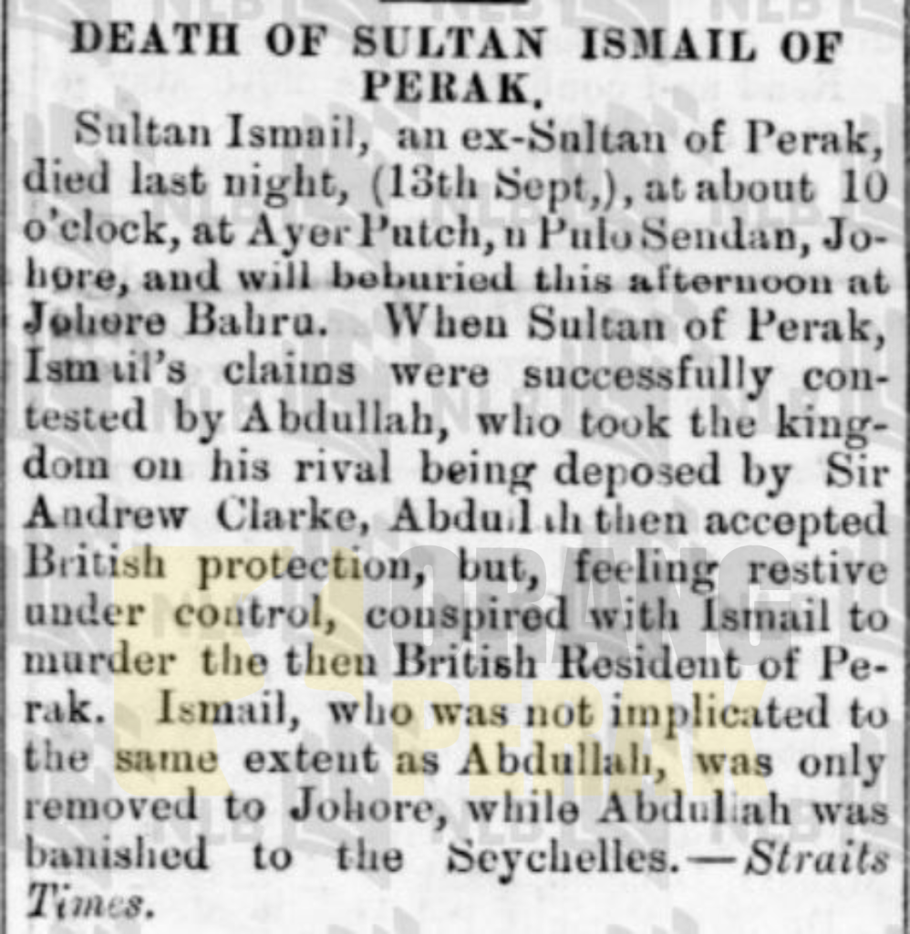 Menurut akhbar tersebut, Sultan Ismail, yang digelar sebagai “ex-Sultan of Perak”, telah mangkat pada malam 13 September 1889, kira-kira jam sepuluh malam, di Ayer Puteh, Pulau Sendan, Johor, dan dimakamkan pada keesokan harinya di Johor Bahru. Catatan ini jelas bertentangan dengan apa yang sering dikemukakan, yang menyebut 4 September 1889 di Skudai.
