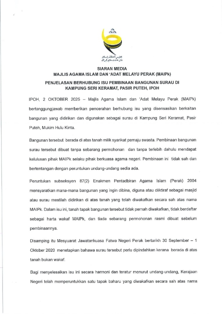 MAIPk menegaskan bahawa tiada sebarang perobohan berlaku, sebaliknya pemindahan surau dilaksanakan dengan penuh tertib dan hormat, serta melibatkan pembinaan semula di tapak wakaf yang sah. Tindakan mengeluarkan kenyataan bersifat provokatif tanpa rujukan fakta hanya mencetuskan kekeliruan dalam kalangan masyarakat.