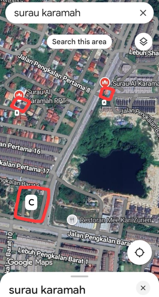 Surau asal Al‑Karamah (ditanda A) terletak di tepi jalan utama dan telah dikenal pasti akan diroboh selepas surau ganti disiapkan. Ia tidak dibina atas tanah wakaf, malah berada di kawasan yang tidak sah di sisi pentadbiran agama negeri.