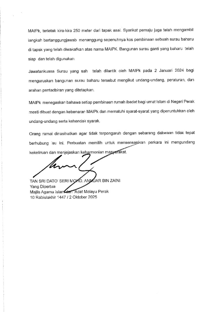 MAIPk ingin menegaskan bahawa semua pembinaan rumah ibadat bagi umat Islam di Negeri Perak perlu mematuhi syarat dan kehendak undang-undang serta syarak. Pembinaan tanpa kebenaran dan tanpa wakaf sah bukan sahaja melanggar peraturan tetapi juga mencabar kesucian institusi wakaf.