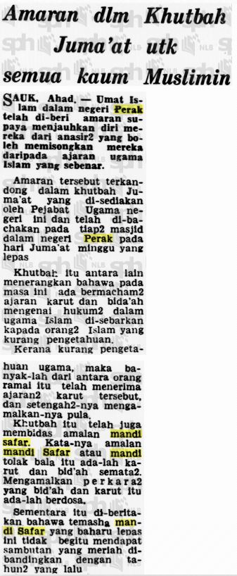 Pada 9hb Julai 1963, Berita Harian melaporkan Timbalan Mufti Johor, Dato’ Dr. Abd. Jalil Hassan menyatakan yang upacara-upacara tu adalah ‘bidaah dan tak masuk akal’. Mufti Singapura turut mengeluarkan fatwa bahawa Mandi Safar adalah haram kerana berunsur syirik.